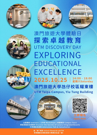 活動費用全免,名額有限,額滿即止。有意參加者需提前於網上報名,詳情及報名可瀏覽(www.utm.edu.mo/s/DiscoveryDay2025)或掃瞄海報上的二維碼。如有查詢可聯繫澳旅大公關範疇(電話:8598 3023/3046或電郵:prteam@utm.edu.mo)。