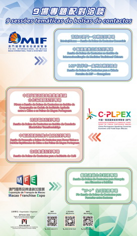 如欲參與三展期間的專題配對洽談等活動,可瀏覽大會網站:www.cplpex.mo、www.mif.com.mo 或 www.mfe.mo;或致電第二屆中葡博覽會專線 (853)2822 8289、第30屆MIF專線(853)2882 8711或2025MFE 專線(853)8798 9654;亦歡迎關注微信號:MICE_IPIM。