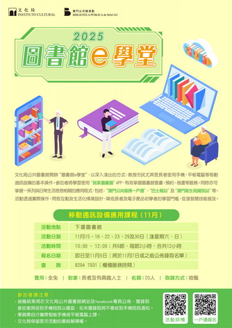 有興趣之市民可自即日起至11月5日透過一戶通的活動報名進行登記,費用全免,倘報名人數多於指定名額時,將以抽籤方式取錄,參加者需自備智能手機或平板電腦上課。查詢可於公共圖書館櫃檯服務時間致電8294 7931,或瀏覽共圖書館網頁(www.library.gov.mo)及「我家圖書館」流動應用程式。