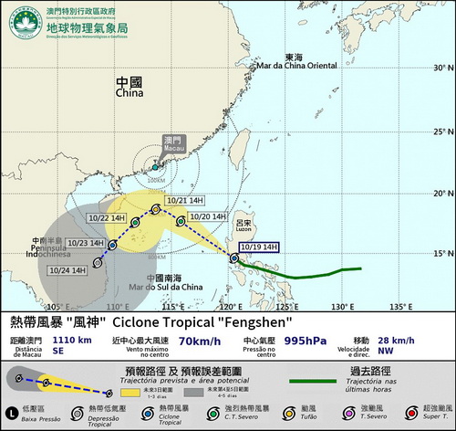 同時,颱風仍然影響南海一帶的天氣,熱帶氣旋「風神」周日已橫過菲律賓進入中國南海,料周日晚間至周一初時進入本澳800公里範圍,並會由「熱帶風暴」級持續增強至「颱風」級,但在東北季風影響下,多個地方的氣象部門都預測「風神」進入南海後的移動路徑會呈倒「V」型,不會正面吹襲廣東沿岸。