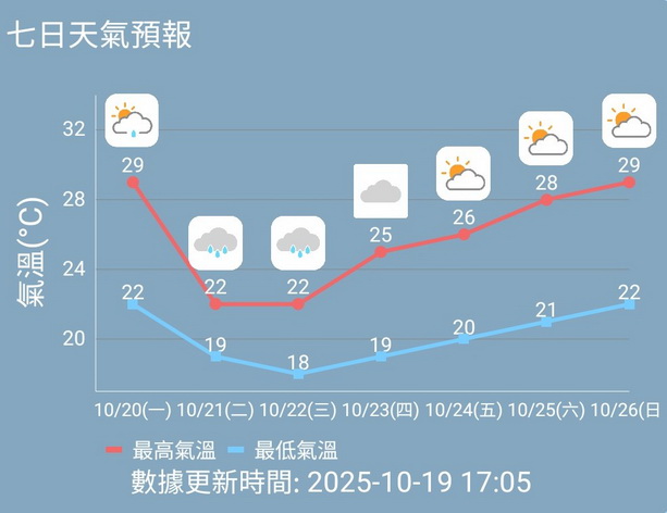 周二氣溫將進一步下降至19度至22度,多雲和間中有雨,吹六至七級偏北風及有陣風,相對濕度介乎百分之70至95之間;周三最低氣溫並將下降至18度左右,多雲且間中有雨,雨勢稍後逐漸減弱,吹五至六級北至東北風及有陣風。