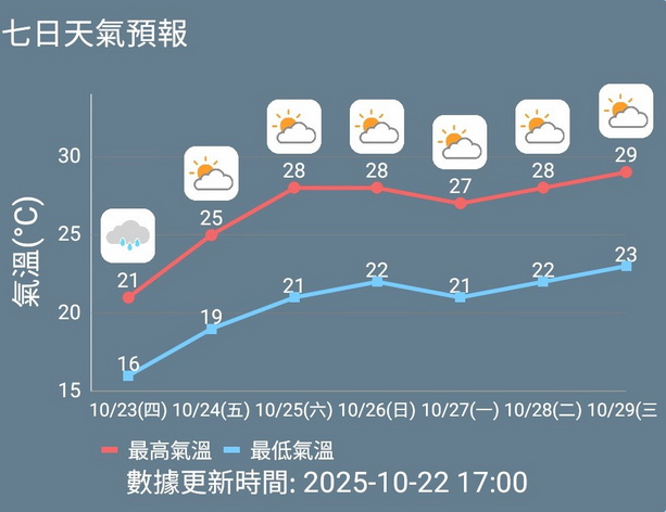 氣象局又指隨後的本周中後期數日東北季風會逐漸緩和,日間有陽光,氣溫也會有所回升,但早晚天氣仍然較涼及天氣乾燥。最低氣溫介乎20至21度之間,日間回升至27至28度之間,氣象局提醒巿民要關注天氣變化,注意適時添衣。