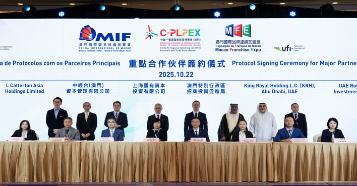 【本報消息】第二屆中國—葡語國家經貿博覽會(澳門)(第二屆中葡博覽會)、第30屆澳門國際貿易投資展覽會(第30屆MIF)及澳門國際品牌連鎖加盟展2025(2025MFE)周三同步揭幕,多家包括世界500 強企業在內的知名海內外企業在開幕儀式上簽署13份合作項目,將為大健康、高新科技、投資基金等重點產業落地本澳發展創造有利條件,並為澳門科技研發產業園儲備優質企業資源。