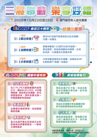 他又提到今年MIF聯動多展同期舉辦,形成疊加協同效應,並聚焦「首發經濟」,相信可進一步挖掘跨境合作新空間、創造產業發展新機遇。未來,特區政府將持續深化「精準聯繫人」作用,以會展產業為重要抓手,推動「產業+會展」深度融合,全力將澳門建設成為國家高水平對外開放重要的橋頭堡。