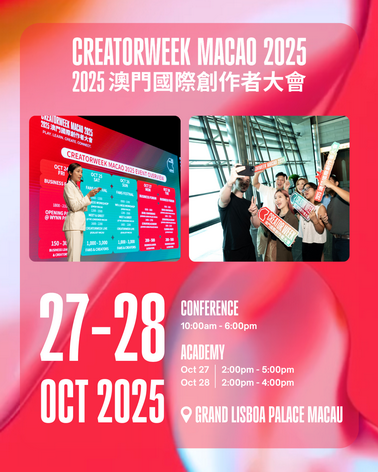 一連五日的亮點活動除了已於剛過去周末舉行的「CreatorWeek現場表演」、「CreatorWeek 健康工作坊」和「CreatorWeek粉絲見面會」外,10月27日及28日還將在澳門上葡京一連兩天舉行「CreatorWeek商業論壇」及「CreatorWeek創作者學院」。