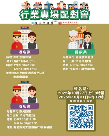 另外,勞工局再與工聯合作於11月上旬辦三場行業專場配對會,合共提供111個空缺。其中11月4日全日舉辦澳娛綜合專場配對會,提供19個職位空缺,涉及銷售經理、助理禮賓司、食品安全及衛生督導、前台主任、葡萄酒侍酒師及前台服務員等。