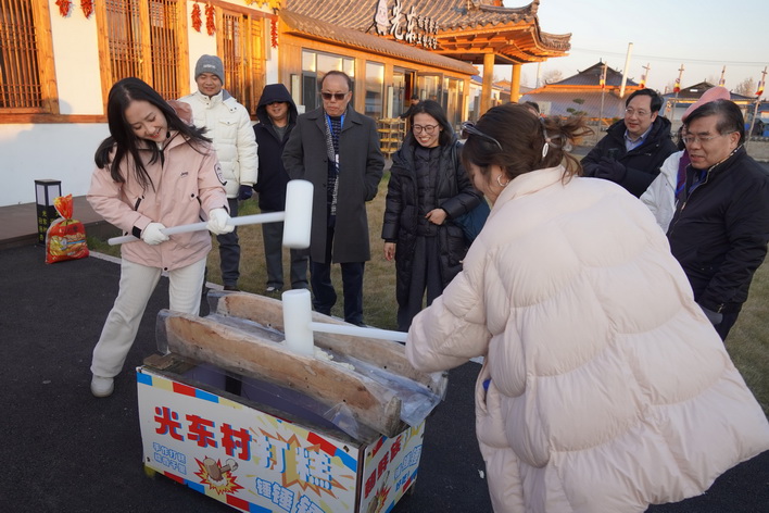 在光東稻香餐廳,參訪團成員圍坐一台,在在該村朝鮮族村民的指導下製作泡菜,將蘋果梨、薑、蒜、辣椒調製的特製醬料,均勻塗抹在已用鹽醃制好的大白菜葉片上,並現場品嘗。隨後,在打糕製作環節,參訪團成員掄起一米多長的實心塑膠錘,有節奏的捶打糯米,體驗傳統手工技藝的樂趣,現場歡聲笑語,氣氛融洽。