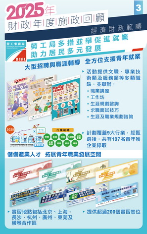 勞工局於畢業季與不同合作伙伴合辦大型招聘會,包括與教育及青年發展局於今年七月合辦大型青年就業配對會及職前輔導會;勞工局隨後再與社團合辦「青年就業博覽會2025」及「促進就業大型招聘會」。這一系列活動提供文職、專業技術類及服務類等多類職缺,並舉辦各類型職業講座、工作坊及生涯規劃諮詢,提供行業發展趨勢、求職面試技巧和生涯及職業規劃諮詢等,為青年提供全面的就業支援與職前準備。
