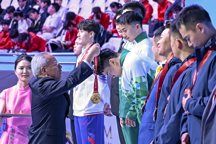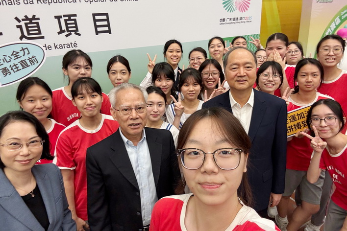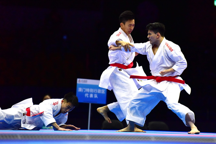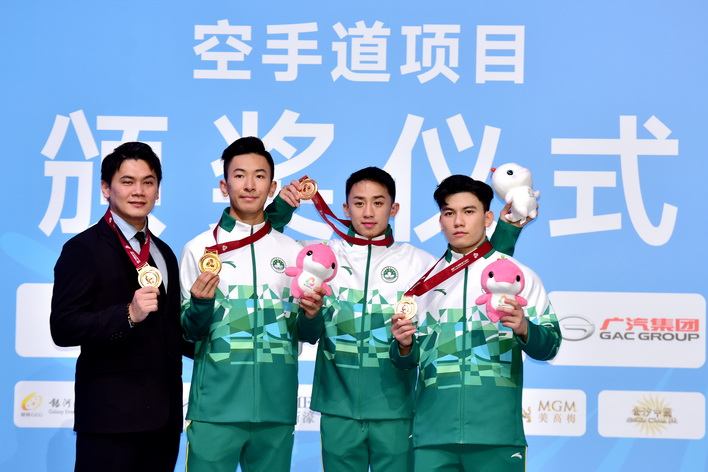 【本報消息】第十五屆全國運動會六日在澳門賽區進行空手道項目,坐擁主場優勢的澳門隊首日比賽即傳來喜訊,郭建恆繼2021年西安全運會勇奪個人型銅牌,為澳門奪得歷史性獎牌後,今屆夥拍隊友鄭沘珞及方文浩在男子組團體型再造出好成績,決賽以42.7分擊敗香港隊摘金,為澳門參加全運會以來首面金牌。澳門特別行政區行政長官岑浩輝出席頒獎禮,親自為澳門運動員頒發獎牌。