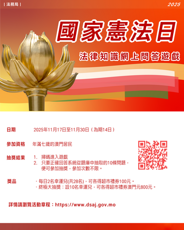 【本報消息】今年是第12個「國家憲法日」,法務局於11月17日至30日期間舉辦「國家憲法日」法律知識網上問答遊戲,透過寓學習於娛樂的遊戲方式,加強社會各界對《憲法》和《澳門基本法》的認識,歡迎本澳居民參加。