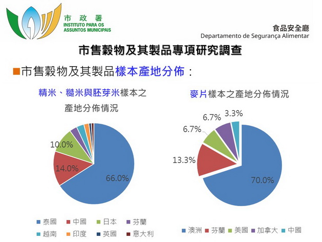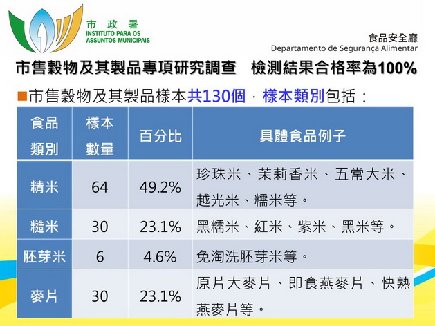 穀物及其製品為本澳市民經常食用的食品,穀物在種植過程中可能因吸收和累積各種重金屬或受外界環境以及貯存不當而遭真菌毒素污染。故市政署開展穀物及其製品專項食品調查,於本澳超級市場等零售場所抽取130個樣本,食品類別包括精米、糙米、胚芽米和麥片,檢測項目包括重金屬無機砷、鎘和鉛,以及真菌毒素黃曲霉毒素B1和赭曲霉毒素A;檢測結果顯示,檢測樣本之重金屬以及真菌毒素檢出量均符合本澳相關食品安全行政法規之相關要求,全部樣本通過檢測,整體合格率為百分之百,顯示本澳穀物及其製品普遍符合本澳相關食安標準。
