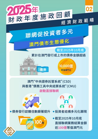 澳門中央證券託管系統與香港的債務工具中央結算系統於今年一月啟動直接聯網機制,標誌著港澳債券市場基礎設施實現互聯互通,為引入多元化的國際投資者參與澳門債券市場創設良好的基礎。國債、廣東省地方政府債以及深圳市地方政府債等優質債券相繼在澳門發行。其中,廣東省發行的25億人民幣地方政府債券,涵蓋綠色債券、藍色債券及第十五屆全國運動會項目的專項債券;深圳市政府發行以應對氣候變化為主題的綠色債券,進一步豐富了債券品種,提升了市場吸引力。國際投資者透過聯網機制參與在澳發行的國債、地方債的認購,使得有關發行認購倍數顯著提升、投資者結構多元顯現。截至2025年10月底,累計已有超過1,000筆債券在澳門發行或上市,金額超過10,000億等值澳門元。