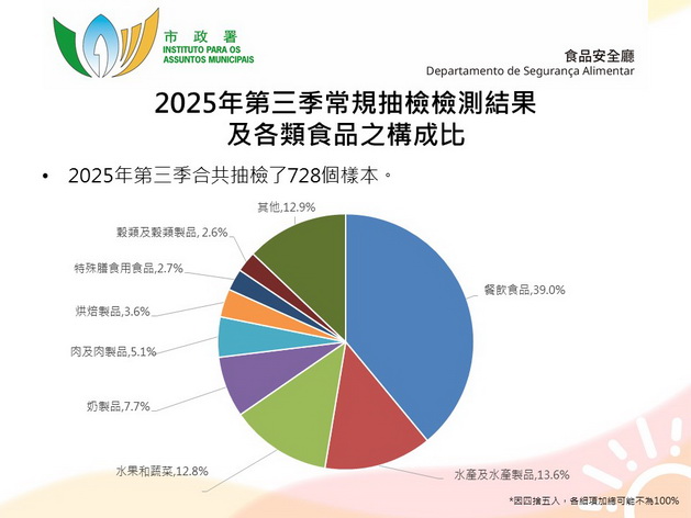 第三季合共抽檢728個食品樣本,包括284個一般市售食品樣本和444個餐飲食品樣本,抽檢點涵蓋本澳各區食肆、外賣店、熟食中心、超級市場、零售鮮活食品場所及雜貨店等。微生物檢測項目包括沙門氏菌屬、單核細胞增生李斯特氏菌、蠟樣芽孢桿菌等常見微生物參數,化學檢測項目包括重金屬、食品添加劑及禁用物質等。