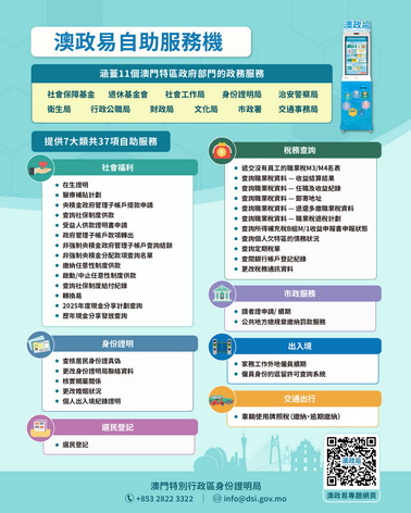 「澳政易」自助服務機提供澳門特區政府有關社會福利、身份證明、稅務查詢、市政服務、選民登記、交通出行及出入境共七個類別,涉及11個部門共37項澳門居民常用的政務服務,便利在區內工作及生活的澳門居民,無需回澳便可辦理所需服務,助力營造澳琴趨同的宜居環境。