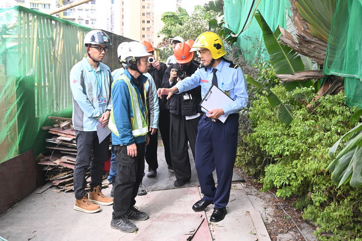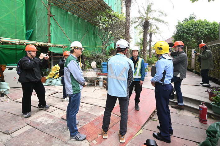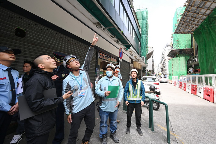 由消防局聯同土地工務局、勞工事務局及市政署組成的巡查隊伍,於11月27日早上兵分多路到高士德、提督馬路、祐漢街市等區,對正在實施外牆或天面翻新工程的住宅及工業大廈開展專項檢查。期間,工作人員向承建商核查棚架工程相關備案資料,核驗是否達標合規,並著重強調承建商需嚴格落實防火主體責任,規範工地設施管理,並重點檢查消防設施配備、危險品存放管理及緊急疏散通道等情況,從源頭排查消除安全隱患。聯合巡查期間所有項目均符合有關的安全要求,承建商亦已按規定出示棚架安全保護網的阻燃合格證明文件。