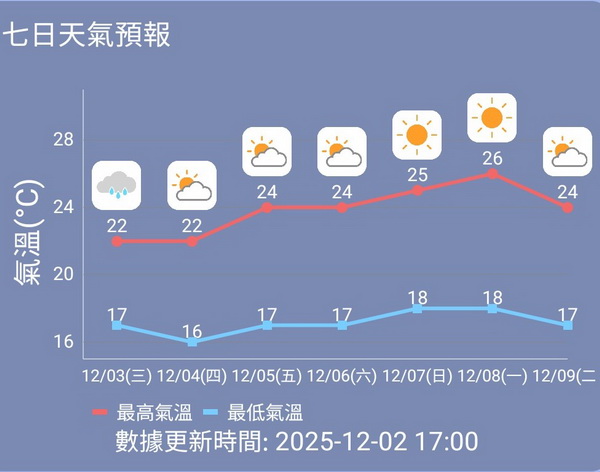 根據當局的七日天氣預報,這股冷空氣由周五起就會緩和,期後多日維持日夜溫差較大情況,預測周五至周六的氣溫介乎17度至24度之間,雲量會日漸減少,陽光會漸漸變多;展望下周日是中國傳統廿四節氣的「大雪」,但氣象局目前預測當澳天晴,氣溫會達18度至25度,下周一天氣同樣明朗,最高氣溫會進一步上升至26度,進一步拉大日夜溫差。