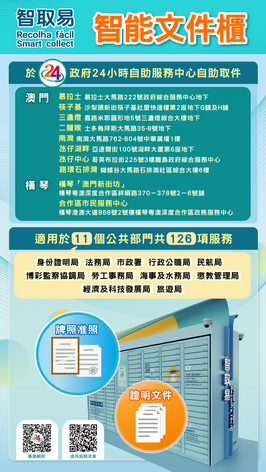 「智取易」智能文件櫃提供24小時自助取件服務,方便市民、商企和社團在申請政府文件後,於澳門和橫琴合作區各政府24小時自助服務中心的文件櫃取件,不受部門辦公時間限制。