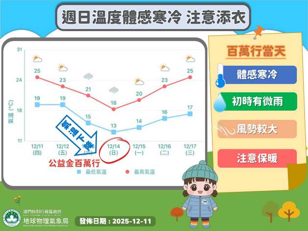 【本報消息】氣象局預測本澳周五天氣仍然和暖,但預料一股冬季季風將在周六抵達華南沿岸,當日晚間本澳氣溫會顯著下降、北風增強及有幾陣雨,下周日最低氣溫更會降至只有約攝氏13度,且體感寒冷。展望下周初期本澳天氣仍以多雲為主、早晚相當清涼及日間乾燥;隨後陽光增多,氣溫逐步回升,下周二起日最高氣溫可望回升至約23度。