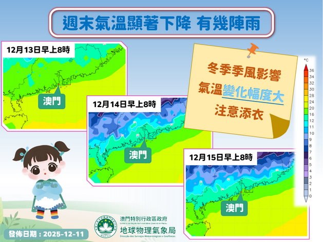 隨著一道冷鋒於周六抵達華南沿岸,本澳天氣漸轉多雲及有幾陣雨,周六晚間氣溫將會顯著下降,氣溫會由日間最高約21度,隨後越夜越凍至晚間將降至最低約15度,風力也會增強至吹五至六級偏北風並有陣風。