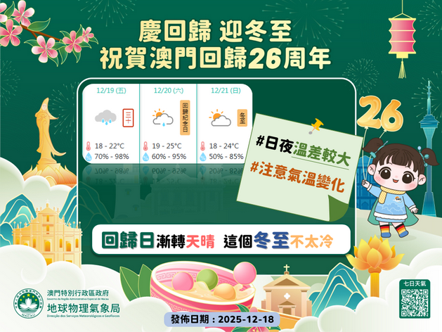 【本報消息】氣象局發出特別推送展望回歸日至聖誕節長假期(20-25日)本澳整體天氣狀況,推送指本澳於回歸日至聖誕期間氣溫感覺較和暖,聖誕過後因東北季風再度增強,氣溫將會下降。