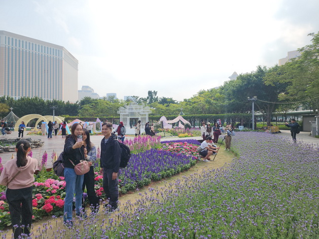 周日是香港聖誕連周末假期最後一天,本澳多個旅遊區人流依然人頭湧湧,當中氹仔舊城區不少備受旅客熱捧的店舖門外排起長長人龍,尤其官也街人流如鯽,至於近日開業的氹仔街市「美食+文創區」人流則稍為遜色,但仍不時見有旅客拖著行李箱到場覓食;而市政署在龍環葡韻一帶舉辦的冬季花卉展「紫色花田」不但吸引途經的旅客,也有不少本地居民利用周末假期到場與三萬盆各式各樣的紫色花卉拍照打卡。
