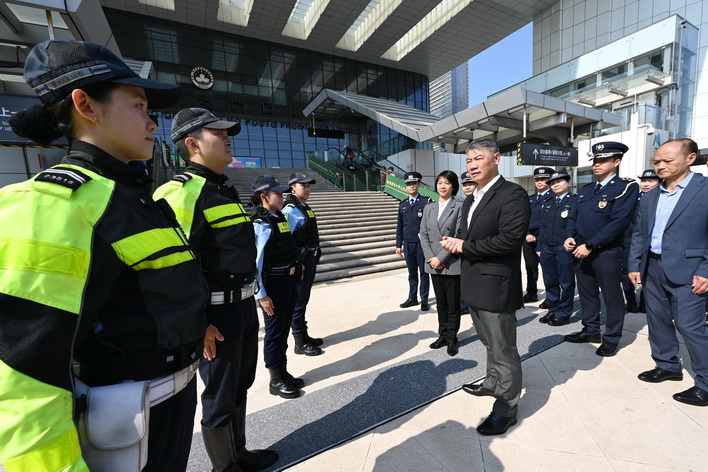 局長及後又前往橫琴口岸澳門口岸區視察通關安排,聽取節日期間客流分流措施簡報,並與珠海出入境邊防檢查總站副總站長、橫琴邊檢站站長石柱、橫琴邊檢站政委鄭戈交流工作部署。