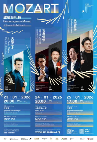 【本報消息】澳門樂團2025-26樂季之「致敬莫扎特」系列音樂會,將於1月23日至25日在玫瑰堂及主教座堂舉行,分別由三位國際知名小提琴家演繹莫扎特早期至藝術巔峰時期的經典作品,引領樂迷跨時空感受「音樂神童」作品的生命力與美感。音樂會設演前導賞、大師班及交流見面會等延伸活動,讓樂迷近距離與藝術家互動交流。