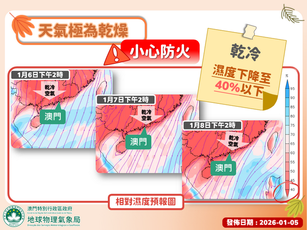 氣象局提醒由於是次冬季季風將伴隨相當乾燥的大陸性氣流,本澳天氣將受其影響變得極為乾燥,相對濕度將下降至40%以下,天乾物燥,市民需注意保暖及補充水分,並務必增強防火意識,杜絕火災隱患。