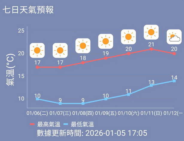 根據氣象局七日天氣預報,周五本澳最低氣溫將重回雙位數,但也只有約10度,最高氣溫約為19度,隨後在冬季季風逐漸緩和下,周末最高氣溫也會略為回升至約20度,但早晚溫差依然較大。