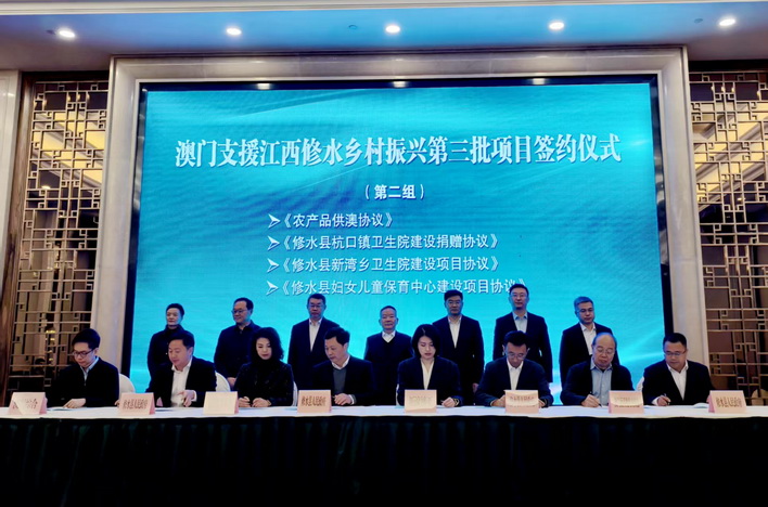 【本報消息】澳門支援江西修水鄉村振興第三批項目簽約日前儀式舉行。政府政策研究和區域發展局局長張作文,中聯辦經濟金融部副部長楊全州,江西省蘇區辦副主任傅小鵬,江西省港澳辦副主任陳俊,九江市政府副市長杜少華,修水縣委書記鄭慶華,修水縣委副書記、縣長劉婕出席,出席簽約儀式的還有本澳政研局、中聯辦經濟金融部、文化局、蔬菜批發商商會、直播協會、江西同鄉會、記者聯會、澳門部分優秀企業和省發改委、省港澳辦等單位有關領導和嘉賓。