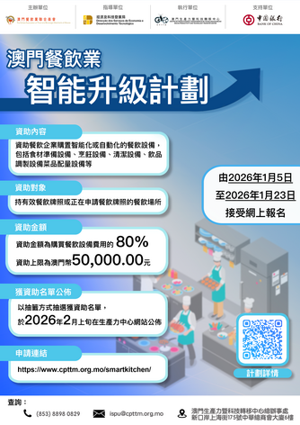 計劃由今年1月5日至23日期間,接受本澳餐飲企業申請。申請者可根據自身營運需要,申請資助購置智能或自動化設備。資助金額為設備費用的八成,上限為50,000澳門元。有意申請的企業可先行聯絡供應商了解設備詳情,確認所需設備後,再透過線上系統提出申請。執行單位將對符合資格的申請名單進行抽籤,中籤名單將於二月在生產力中心網站公佈。