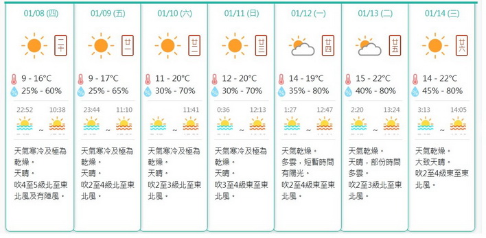 根據氣象局未來七日天氣預測,周四本澳天氣維持寒冷及極為乾燥情況,日間天晴及吹三至四級北至東北風,氣溫介乎9至16度之間,相對濕度介乎百分之25至60之間,最高紫外線指數約為六,級別屬於高。