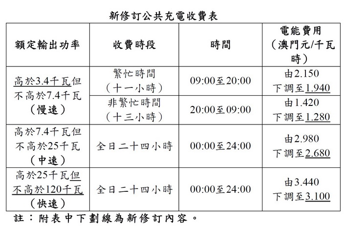 根據第1/2026號行政長官批示,慢速充電在繁忙時間的電能費用將下調至每千瓦時1.94元、非繁忙時間1.28元;中速電能費用降至每千瓦時2.68元;快速電能費用則減至 3.1元;是次修改同時調整了慢充和快充的額定輸出功率,其中慢充增加額定輸出功率下限為高於3.4千瓦,上限維持為不高於7.4千瓦,高速增加輸出上限為不高於120千瓦,下限維持高於25千瓦,中速則維持為高於7.4千瓦但不高於25千瓦。