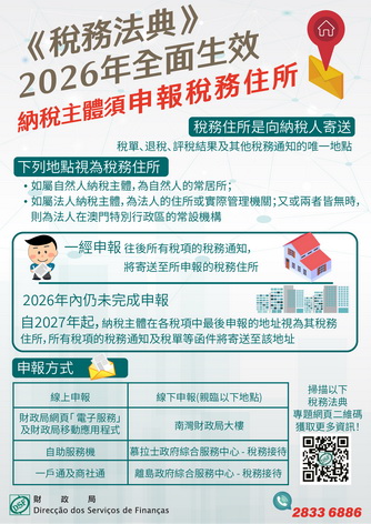 【本報消息】為配合《稅務法典》的生效,納稅主體須按法律規定於2026年1月1日至12月31日期間,向稅務行政當局申報稅務住所。稅務住所是用於稅務行政當局向納稅人寄送如稅單、退稅、評稅結果及其他稅務通知的唯一地點。