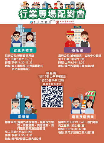 21日下午資訊科技業專場配對會在澳門馬揸度博士大馬路221-279號先進廣場地下勞工局多功能會議室舉行;22日上午酒店業專場配對會及下午保潔業專場配對會,以及23日下午電訊及電商業專場配對會,均在沙梨頭工聯大廈二樓舉行。報名日期均由1月15日上午九時起至20日中午12時。