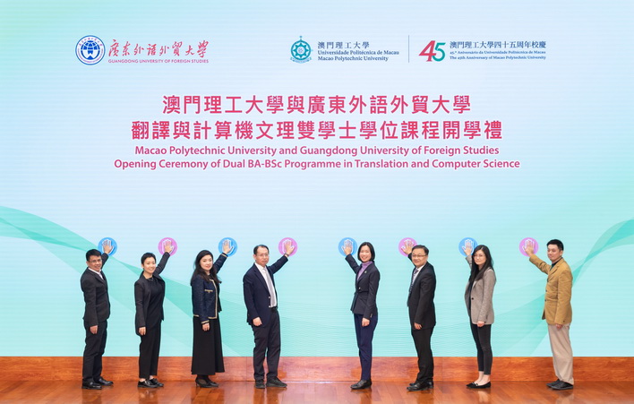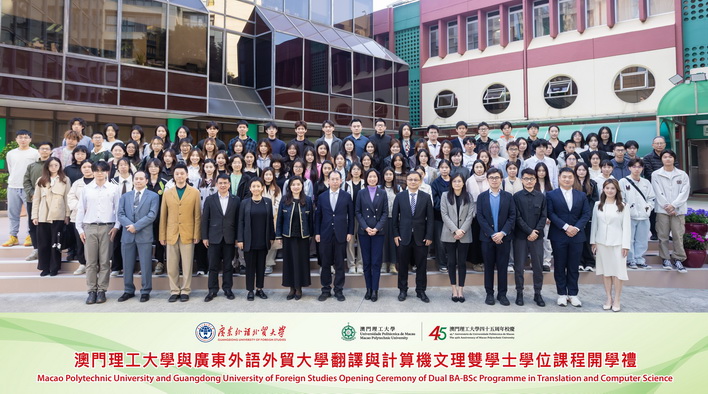 【本報消息】在《粵港澳大灣區發展規劃綱要》發佈七周年之際,澳門理工大學與廣東外語外貿大學合辦的「翻譯及計算機文理雙學士學位課程開學禮」在理大舉行,歡迎廣外—理大合作辦學項目首屆學生開啟澳門段學習新旅程。理大代校長李雁蓮、廣外副校長申明浩、兩校項目負責人,以及課程學生一百多人出席典禮,共同見證項目踏上新台階。