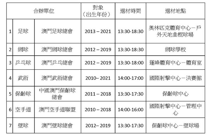 【本報消息】為了讓更多有興趣參與體育運動的青少年了解不同的體育項目,體育局與相關單項體育總會合辦的澳門青少年體育學校將於1月31日及2月1日舉行體驗及選材日活動。