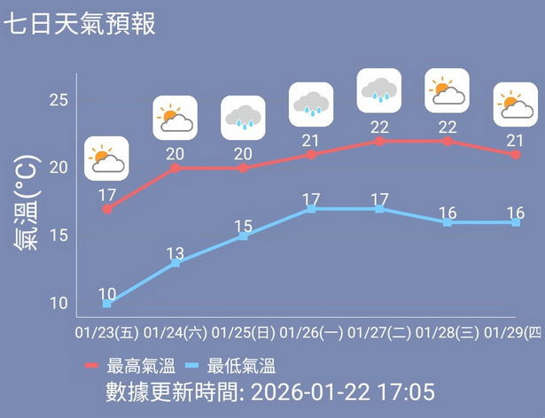 鄰埠香港天文台表示,冬季季候風會在未來一兩日繼續為華南帶來寒冷的天氣,而覆蓋該區的廣闊雲帶會稍為轉薄,當地周五早上天氣仍然寒冷,市區最低氣溫約12度,新界再低兩三度,日間部分時間天色明朗及乾燥,最高氣溫約17度,吹和緩東北風,初時風勢間中清勁。