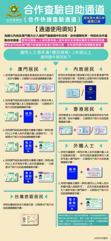 澳珠兩地邊檢部門於2024年10月28日起,率先在橫琴口岸試點擴大「合作查驗自助通道」適用範圍,新增三類外國護照持用人可使用該通道。數據顯示,2025年全年,持外國護照經橫琴口岸「合作查驗自助通道」通關的人員累計達3.4萬人次。