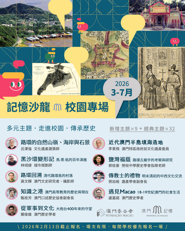 【本報消息】由澳門基金會主辦的記憶沙龍校園專場(中學場),致力向本澳中學生傳播澳門在地歷史文化,探索小城在地歷史及社會脈絡,推廣澳門形象。2026年的校園專場講座將於三月至七月期間舉辦,現正開始接受報名,歡迎本澳學校組織參加。