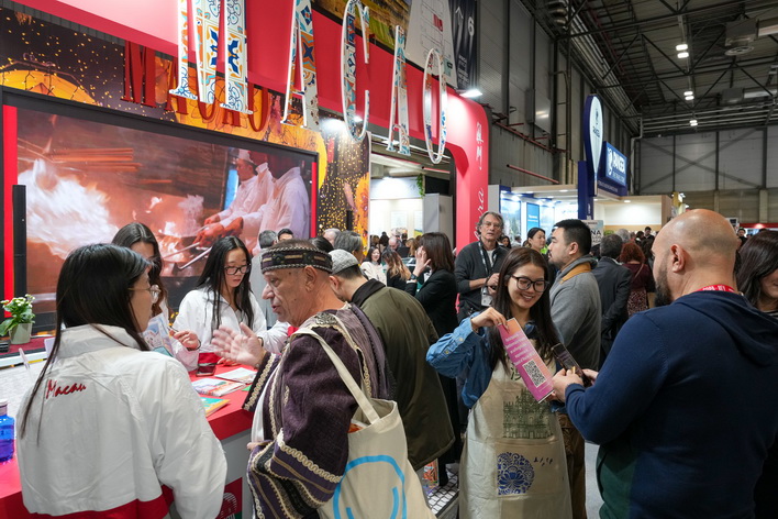 澳門展館今年以更豐富的元素展示澳門多元「旅遊+」及中西文化交融的獨特魅力。館內特設葡萄牙土風舞、太極、詠春與葡萄牙瓷磚彩繪等澳門非物質文化遺產體驗工作坊及澳葡特色小食,讓歐洲業界親身感受澳門多元文化與旅遊資源,有利設計更多深度遊及“一程多站”聯遊產品,現場吸引眾多業界人士駐足參與。
