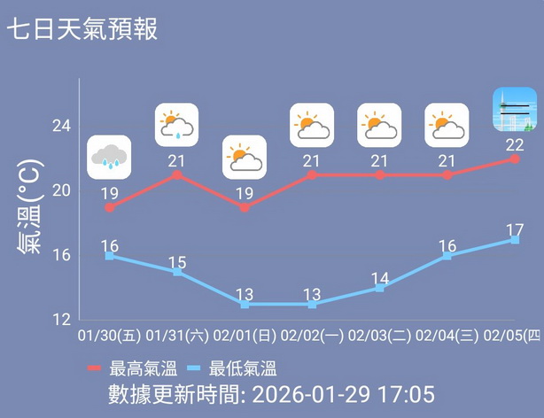 告別一月份後,下周日將迎來二月份首日,氣象局預測當日本澳氣溫略降至13度至19度,多雲,部份時間有陽光,吹三至五級北至東北風及有陣風;下周一低溫仍然僅得13度,但當日天色明朗、天晴及部份時間多雲,日間氣溫會回升至21度,吹三至四級北至東北風。下周二料將維持明朗的好天氣,最低氣溫會略為上升一度至14度,最高氣溫則維持在21度左右。