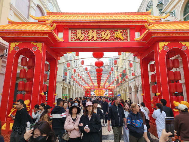今年內地春節假期長達九天,本澳旅遊部門早前預料屆時日均旅客量約為15.8萬至17.5萬人次,不過預期部份內地旅客會更傾向於節前來澳辦年貨,或假期後錯峰出遊;過去的周六和周日是農曆新年前倒數第二個周末假期,即使遇上北風降溫,市面旅客仍明顯增多,不少旅客到議事亭至大三巴一帶購買兼觀光,除了到商店購買新春應節糖果和餅乾外,區內的運動用品和成衣店亦人頭湧湧,部份店舖並推出折扣優惠作招徠。