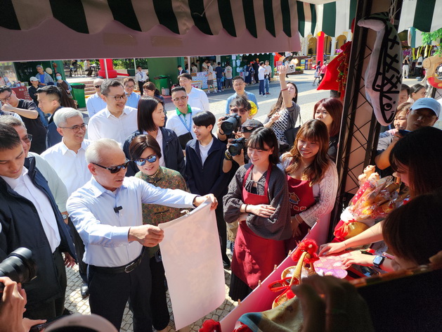 來到售賣手寫揮春的攤檔前時,岑浩輝立即認出檔主去年也有擺檔,檔主應岑浩輝邀請即席揮毫書寫「龍馬精神」四字,岑浩輝買下該幅揮春並借此祝願本澳居民在新的一年裡身體健康、朝氣蓬勃、精神煥發,而檔主還準備了一副寫有「英明領導澳安康,馬來運轉百業旺」對聯贈送岑特首。
