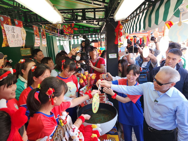 除揮春外,他亦選購了多種賀年物品和年花,並不時向在場的居民和遊客互道吉祥話語,又應邀合照留念。