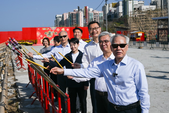 岑浩輝亦親身體驗燃放爆竹及煙花火箭的樂趣,並藉此祝願偉大祖國一馬當先、澳門特區馬到功成、廣大居民馬年大吉、幸福安康。陪同參觀的有行政法務司司長黃少澤、市政署市政管委會主席周偉迎、市諮委主席許樂敏等。