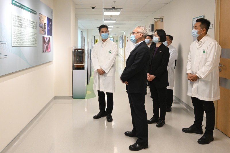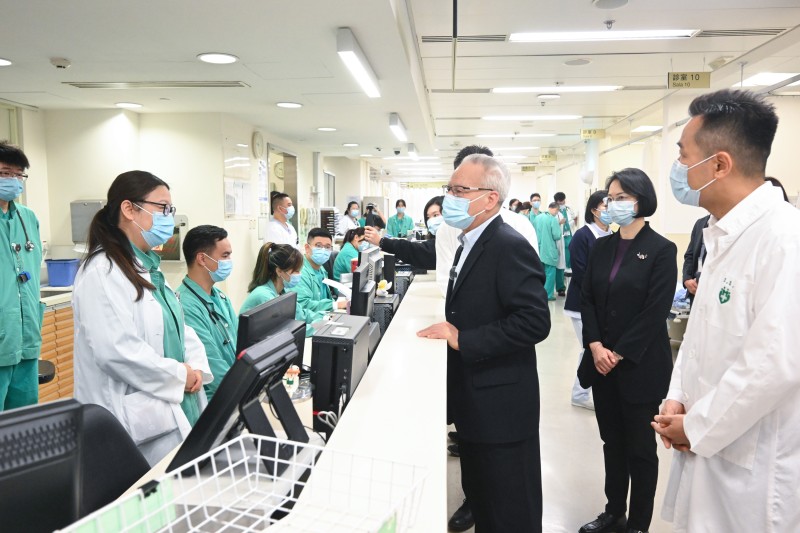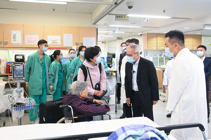 岑浩輝在社會文化司司長柯嵐及衛生局局長羅奕龍等陪同下,首先到仁伯爵綜合醫院視察。一行先到急診部及救護車區,瞭解新春假期急診服務運作情況,並關懷前線醫護人員的工作狀況。隨後抵達專科大樓病房,聽取專科服務運作介紹,期間慰問求診人士,並與醫院當值醫護人員親切交談,為他們加油打氣。岑浩輝祝願醫護人員身體健康,感謝他們不論何時,始終履職盡責、堅守崗位,盡心盡力為廣大居民提供醫療服務。