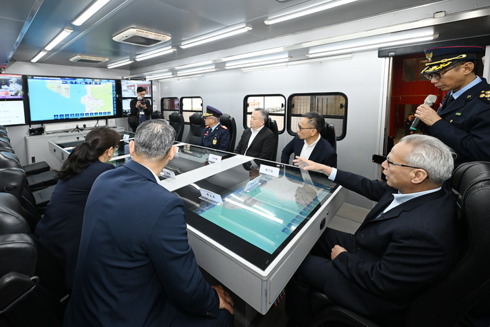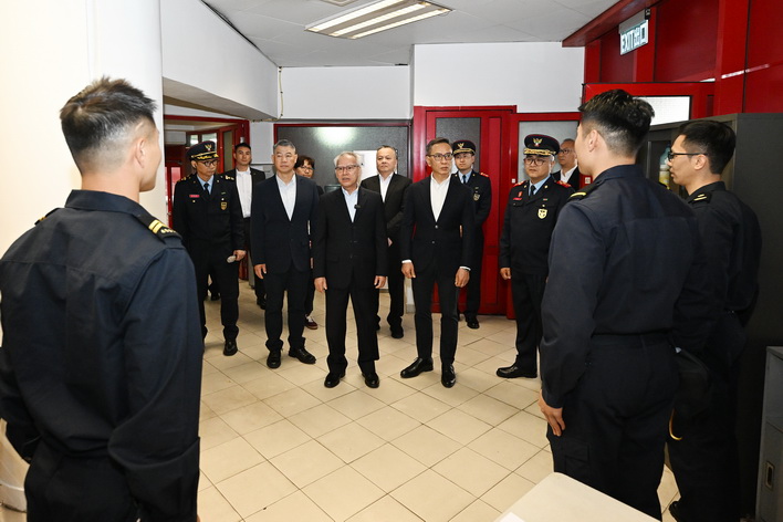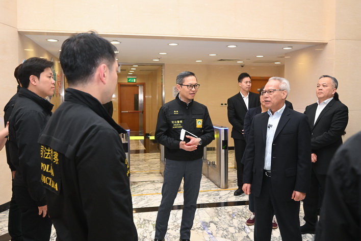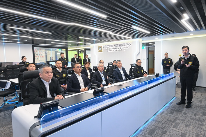 岑浩輝之後再走訪消防局黑沙環行動站,以及司法警察局大樓的網絡安全事故預警及應急中心、反詐騙協調中心。在保安司司長陳子勁、警察總局局長梁文昌、海關關長何浩瀚等陪同下,岑浩輝先後聽取了消防局局長王健和司警局局長薛仲明介紹兩局在節假日期間的工作部署,並了解各項警務和消防設施的運作情況。