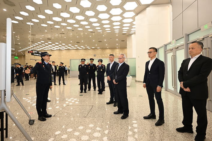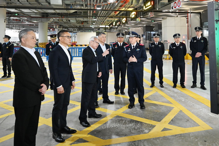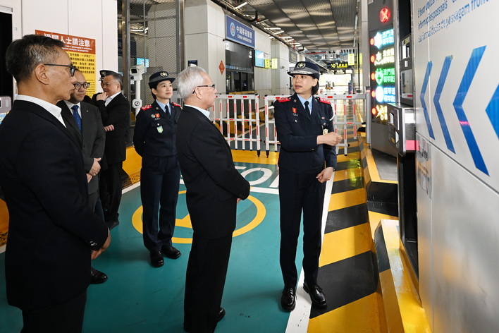最後,岑浩輝抵達橫琴口岸視察離境大廳及汽車通道,先後聽取治安警察局代局長伍素萍、保安部隊事務局局長劉運嫦、海關助理關長葉華釗的口岸工作匯報,瞭解節假日期間的口岸通關情況、人潮管制方案、“刷臉”智能通關運作及擴建通道規劃、車道貨檢和旅客通關查驗等各項工作安排。