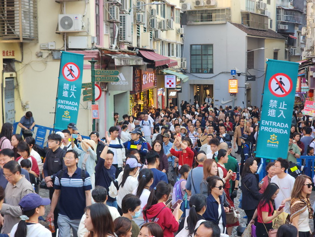 周日雖然已是內地春節假期尾聲,但仍有大批旅客抵澳,本澳多個旅遊區依然人頭湧湧,尤其是大三巴街一帶,警方分別在下午12時55分和4時50分兩度實施單向人潮管制措施,行人只可以由大三巴街單向上行至前往大三巴牌坊,並需要取道周邊街巷如大關斜巷、關前後街和高園街等離開。